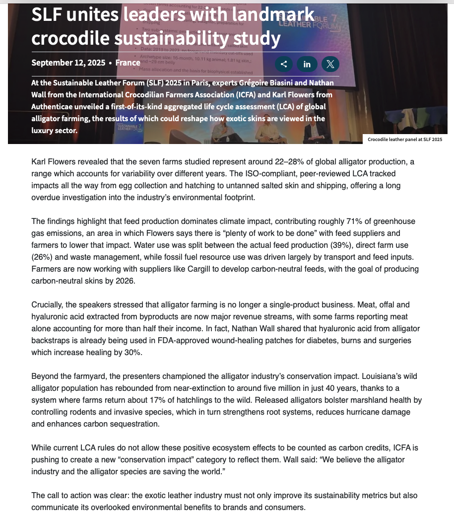 "Le cuir exotique est l’un des matériaux les plus durables de la mode aujourd’hui. Contrairement aux alternatives synthétiques, il ne détruit pas les habitats — il les sauve. Il permet aux écosystèmes de prospérer, protège les espèces menacées et soutient les communautés locales qui dépendent de ces ressources pour survivre." Lien vers l'article.